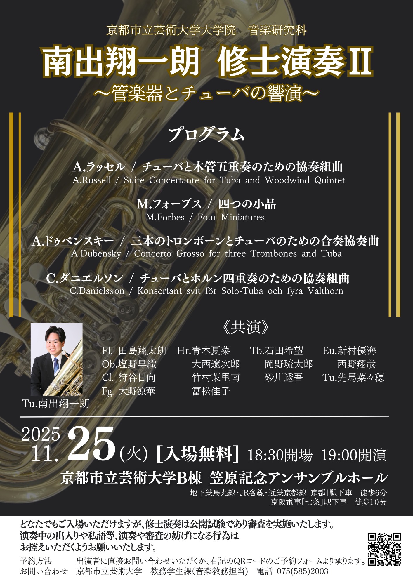 南出翔一朗 修士演奏Ⅱ2025/11/25京都市立芸術大学 堀場信吉記念ホール開催予定大学関連演奏会