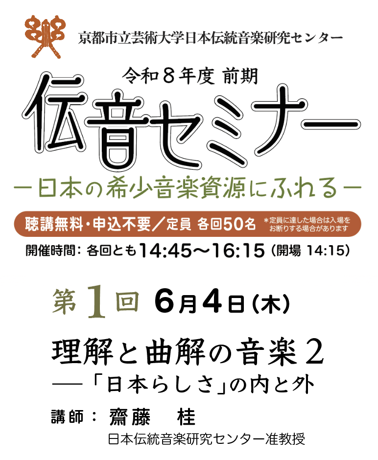 〈第1回〉 理解と曲解の音楽2 -「日本らしさ」の内と外2026/06/04京都市立芸術大学 伝音セミナールーム開催予定大学関連公開講座