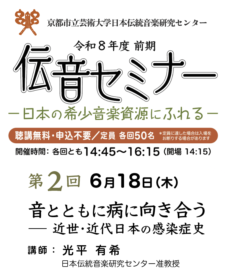 〈第2回〉音とともに病に向き合う -近世?近代日本の感染症史2026/06/18京都市立芸術大学 伝音セミナールーム開催予定大学関連公開講座